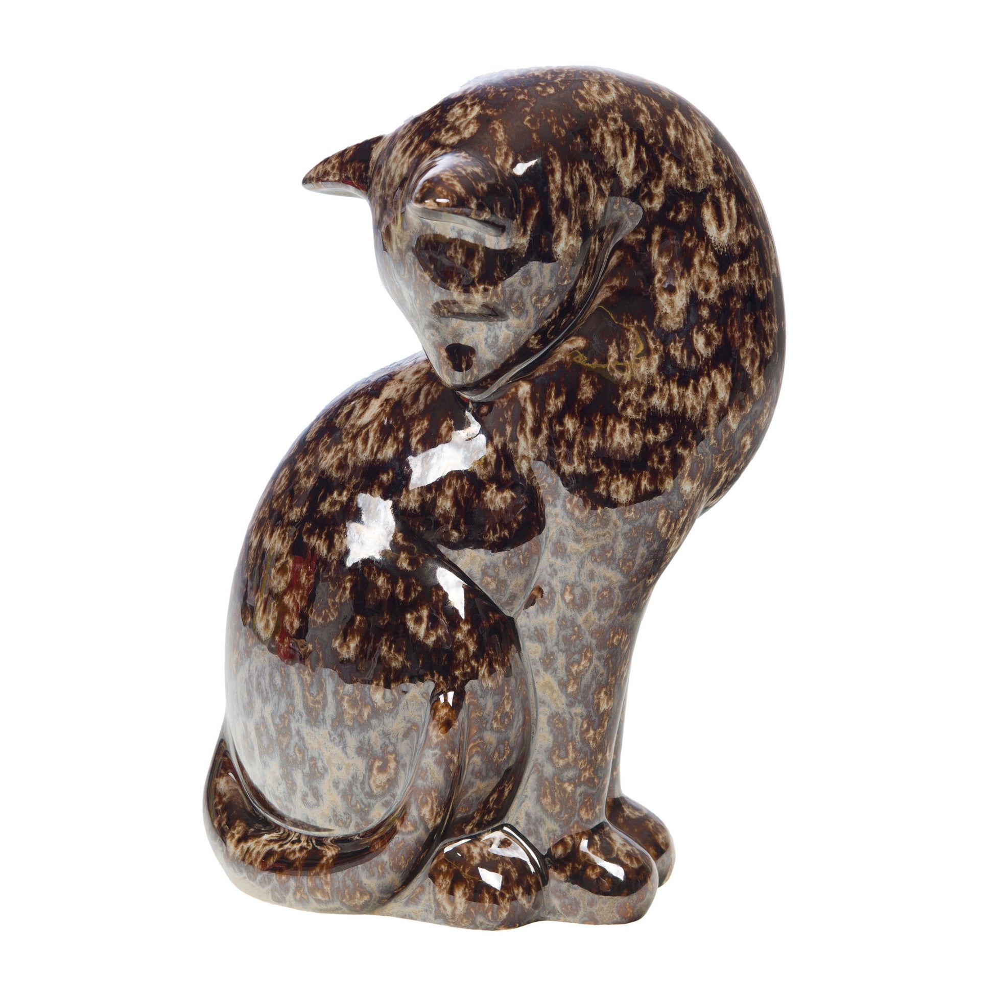 Chat en céramique émaillée, couleur bronze, dimensions 26x12x18 cm.
