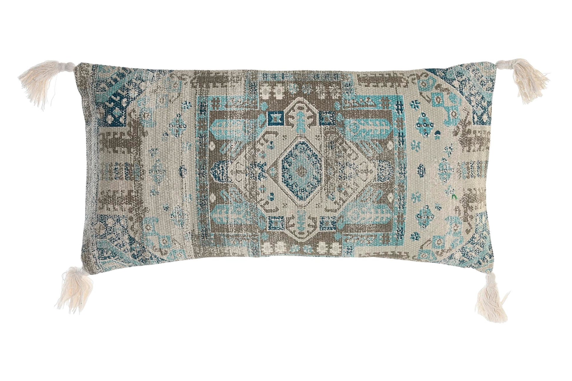 Coussin FLEC à pompons, en coton crème et bleu.
