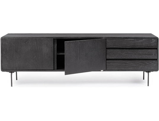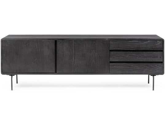 Meuble tv WIDA plaqué bois de frêne, finition naturelle avec peinture noire. Compartiments des portes contenant une étagère interne, tiroirs avec glissières coulissantes en acier. Pieds en acier peints. Ce meuble TV pratique et au design classique existe également en bois clair.