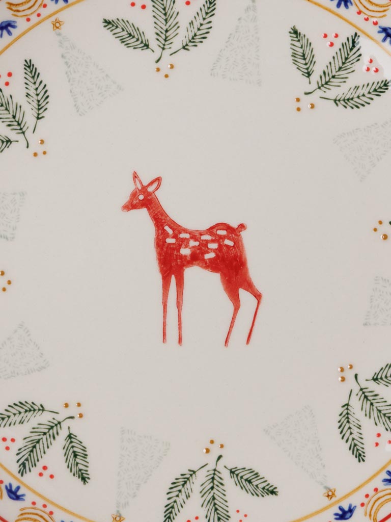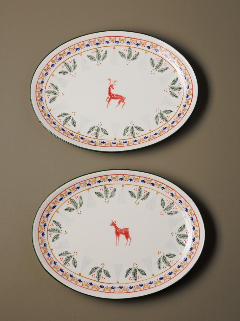 Plats de service en grès décoré Cerf, en rouge et bleu, 2 décors différents