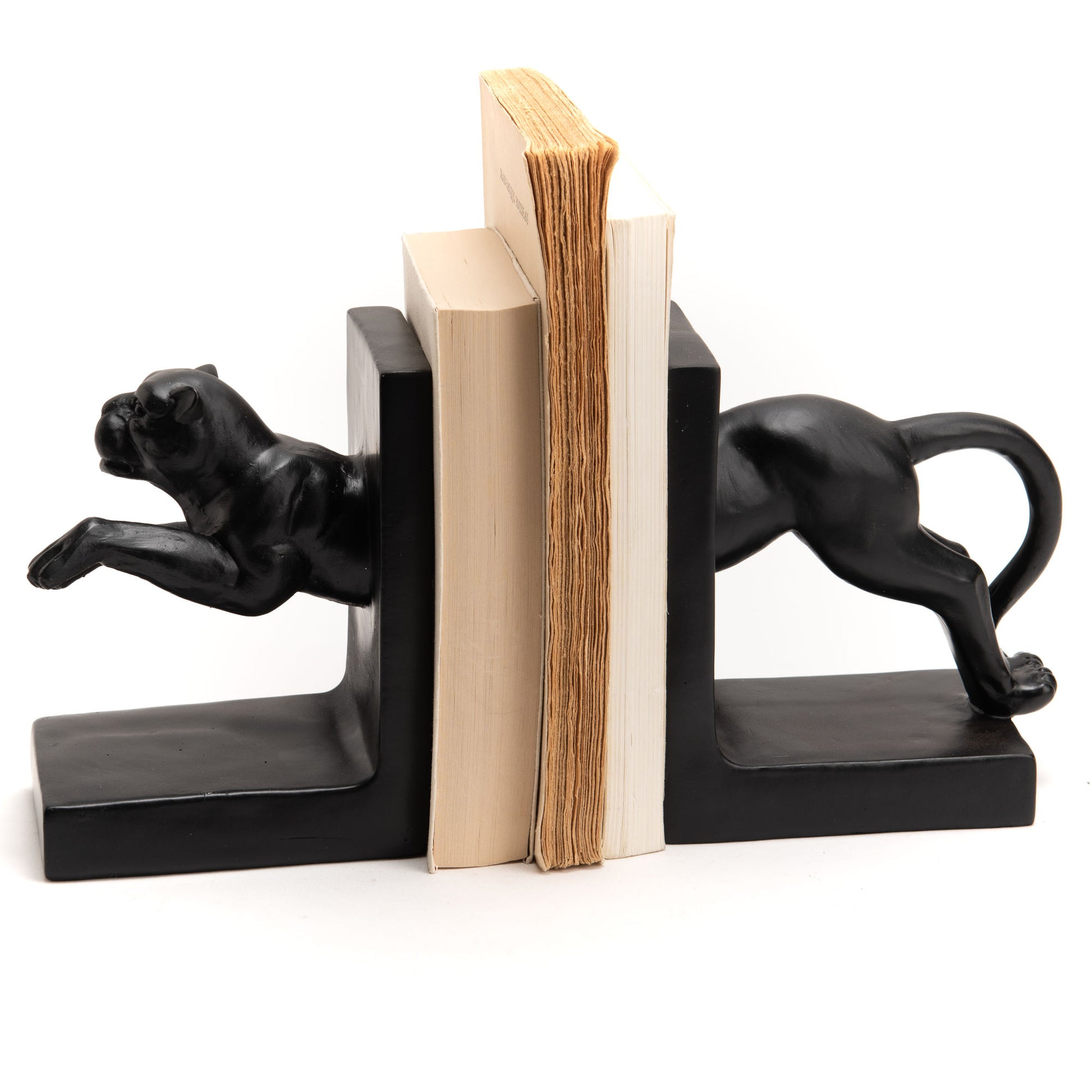 Serre-livres panthère en résine, couleur noir mat, dimensions 27x17x9 cm.